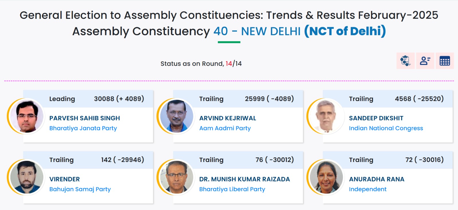 ಚುನಾವಣಾ ಆಯೋಗದ ವೆಬ್ಸೈಟ್ ನೀಡಿದ ಮಾಹಿತಿಯಂತೆ ಕ್ಷೇತ್ರದ ಒಟ್ಟು 14 ಸುತ್ತಿನ ಎಣಿಕೆಯಲ್ಲಿ 13ನೇ ಸುತ್ತಿನಲ್ಲಿ ಕೇಜ್ರಿವಾಲ್ ಅವರಿಗೆ 25,999 ಮತಗಳು ಲಭಿಸಿದ್ದು, ಬಿಜೆಪಿಯ ಪರ್ವೇಶ್ ವರ್ಮಾ ಅವರಿಗೆ 30,088 ಮತಗಳು ಲಭ್ಯವಾಗಿದೆ. ಈ ನಡುವೆ ಕಾಂಗ್ರೆಸ್ನ ಸಂದೀಪ್ ದೀಕ್ಷಿತ್ ಅವರಿಗೆ 4,568 ಮತಗಳು ಲಭ್ಯವಾಗಿದೆ.