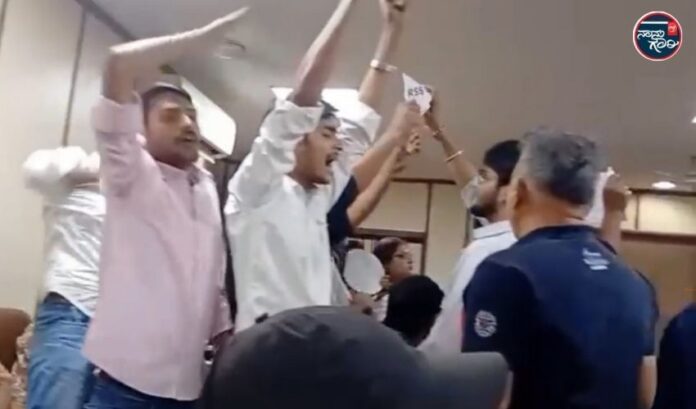 ಆರ್‌ಎಸ್‌ಎಸ್ ಬ್ಯಾನರ್ ಅಡಿಯಲ್ಲಿ ಕಾಲೇಜು ಸಭಾಂಗಣದಲ್ಲಿ ನಡೆದ “ಸೇವೆ, ಸಂಘಟನೆ, ಸಂಸ್ಕೃತಿ ಮತ್ತು ಅಭಿವೃದ್ಧಿ ಹೊಂದಿದ ಭಾರತದಲ್ಲಿ ಯುವಕರ ಪಾತ್ರ” ಎಂಬ ಶೀರ್ಷಿಕೆಯ ಕಾರ್ಯಕ್ರಮವನ್ನು ವಿರೋಧಿಸಿ ಈ ಪ್ರತಿಭಟನೆ ನಡೆಸಲಾಯಿತು.