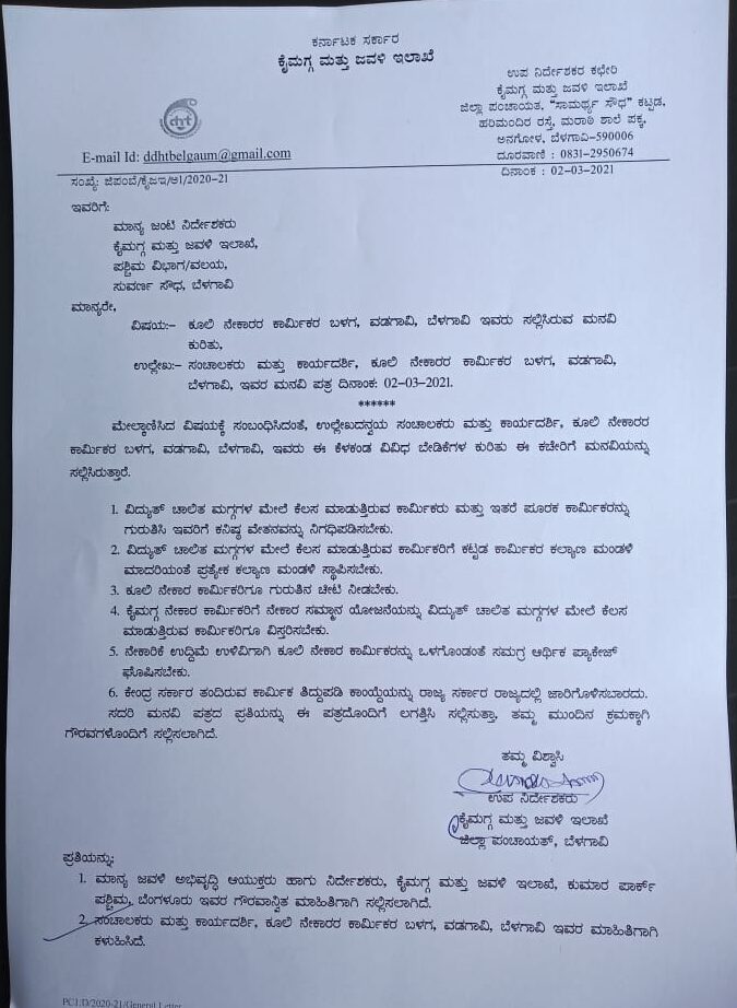 ಕೂಲಿ ನೇಕಾರರ ಕಾರ್ಮಿಕ ಬಳಗದ ಬೇಡಿಕೆಗಳ ಮನವಿ ಪತ್ರ ಇಲ್ಲಿದೆ.