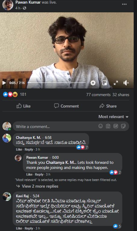 ಪವನ್ ವಿಡಿಯೋಗೆ ಹಲವು ಮಂದಿ ಪ್ರತಿಕ್ರಿಯಿಸುತ್ತಿದ್ದು, ನಿರ್ದೇಶಕ ಪಿ.ಶೇಷಾದ್ರಿ, ಚೈತನ್ಯ ಕೆ.ಎಂ ನಿಮ್ಮ ಪ್ರಯತ್ನಕ್ಕೆ ನನ್ನ ಬೆಂಬಲ ಇದೆ. ನಾನು ಕೈ ಜೊಡಿಸುತ್ತೇನೆ ಎಂದು ಕಾಮೆಂಟ್ ಮಾಡಿದ್ದಾರೆ. ಚಿತ್ರ ಸಾಹಿತಿ ಕವಿರಾಜ್ ಕೂಡ ಕಾಮೆಂಟ್ ಮಾಡಿದ್ದು, ಸೋಶಿಯಲ್ ಮೀಡಿಯಾದಲ್ಲಿ ಚಿತ್ರ ಬಿಡುಗಡೆ ಮಾಡುವ ಉಪಾಯ ಸೂಚಿಸಿದ್ದಾರೆ.