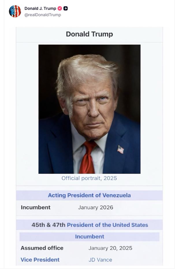 ಪೋಸ್ಟ್ನಲ್ಲಿ ಟ್ರಂಪ್ ಅವರ ಅಧಿಕೃತ ಭಾವಚಿತ್ರವಿದ್ದು, ನಂತರ “ವೆನೆಜುವೆಲಾದ ಹಂಗಾಮಿ ಅಧ್ಯಕ್ಷ, “ಜನವರಿ 2026 ರಲ್ಲಿ ಅಧಿಕಾರ ವಹಿಸಿಕೊಂಡವರು” ಎಂದು ಬರೆಯಲಾಗಿದೆ, ನಂತರ ಅವರನ್ನು ಅಮೆರಿಕದ 45 ಮತ್ತು 47 ನೇ ಅಧ್ಯಕ್ಷರನ್ನಾಗಿ ಹೆಸರಿಸಲಾಗಿದೆ.