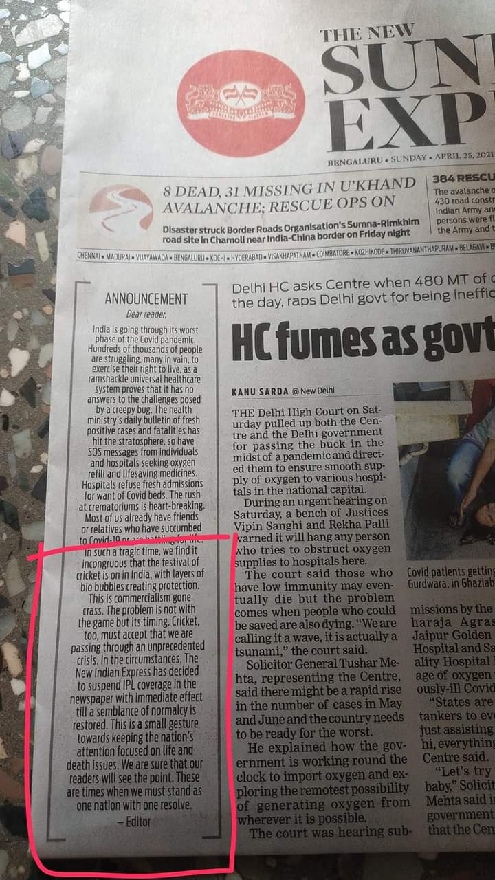 ‘ದೇಶವು ಕೋವಿಡ್ ಎರಡನೆ ಅಲೆ ಉಲ್ಬಣದಿಂದ ತತ್ತರಿಸಿರುವ ಈ ಸಮಯದಲ್ಲಿ ಐಪಿಎಲ್ ಎಂಬ ಕ್ರಿಕೆಟ್ ಹಬ್ಬ ನಡೆಯುತ್ತಿರುವುದು ವಿಷಾದಕರ. ದೇಶದ ಸಂಕಷ್ಟದ ಜೊತೆ ನಿಂತು ಜನರಲ್ಲಿ ನೈತಿಕ ಶಕ್ತಿ ತುಂಬುವುದರ ಸಂಕೇತವಾಗಿ ನಾವು ಈಗಿನಿಂದಲೇ ಕ್ರಿಕೆಟ್ ಹಬ್ಬದ ಕವರೇಜ್ ನಿಲ್ಲಿಸಿದ್ದೇವೆ ಮತ್ತು ಅದಕ್ಕೆ ಸಂಬಂಧಿಸಿದ ಯಾವ ಸುದ್ದಿಯನ್ನೂ ಪ್ರಕಟಿಸದಿರಲು ನಿರ್ಧರಿಸಿದ್ದೇವೆ’ ಎಂದು ದಿ ನ್ಯೂ ಇಂಡಿಯನ್ ಎಕ್ಸ್‌ಪ್ರೆಸ್ ಸಂಪಾದಕೀಯ ಮಂಡಳಿ ಇಂದು ರವಿವಾರ ಮುಖಪುಟದಲ್ಲೇ ಪ್ರಕಟಣೆ ನೀಡಿದ್ದು, ಇದೊಂದು ಜರೂರಾದ ನೈತಿಕ ನಡೆ ಎಂದು ಓದುಗರಿಂದ ಪ್ರಶಂಸೆ ವ್ಯಕ್ತವಾಗಿದೆ.