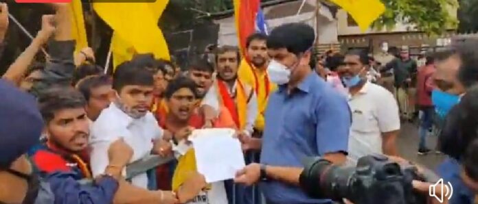 ಕನ್ನಡಪರ ಹೋರಾಟಗಾರರ ಮೇಲೆ ಲಾಠಿ ಚಾರ್ಜ್ ಮಾಡಿದ ಶಿವರೆಡ್ಡಿಯವರನ್ನು ಅಮಾನತು ಮಾಡಬೇಕು, ಬೆಳಗಾವಿಯ ಪೀರನವಾಡಿಯ ಅದೇ ಸ್ಥಳದಲ್ಲಿ ಕೂಡಲೇ ಪ್ರತಿಮೆ ನಿರ್ಮಾಣ ಮಾಡಬೇಕು ಎಂದು ಆಗ್ರಹಿಸಿ ಕರ್ನಾಟಕ ರಣಧೀರರ ಪಡೆಯ ನೇತೃತ್ವದಲ್ಲಿ ಬೆಂಗಳೂರಿನ ಮೌರ್ಯ ವೃತ್ತದಲ್ಲಿ ಪ್ರತಿಭಟನೆ ನಡೆಸಲಾಯಿತು.