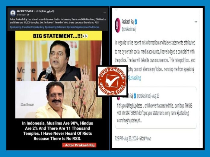 “ಇಂಡೋನೇಷ್ಯಾದಲ್ಲಿ ಶೇ.90ರಷ್ಟು ಮುಸ್ಲಿಮರು ಮತ್ತು ಶೇ.2ರಷ್ಟು ಹಿಂದೂಗಳಿದ್ದಾರೆ. ಆ ದೇಶದಲ್ಲಿ 11,000 ದೇವಾಲಯಗಳಿವೆ. ಆದರೆ, ಅಲ್ಲಿ ಯಾವುದೇ ಗಲಭೆಗಳು ನಡೆದಿರುವ ಬಗ್ಗೆ ಕೇಳಿಲ್ಲ. ಏಕೆಂದರೆ ಅಲ್ಲಿ ಆರ್ಎಸ್ಎಸ್ ಇಲ್ಲ” ಎಂದು ನಟ ಪ್ರಕಾಶ್ ರಾಜ್ ಹೇಳಿರುವುದಾಗಿ ಸಾಮಾಜಿಕ ಜಾಲತಾಣಗಳಲ್ಲಿ ಪೋಸ್ಟರ್ ಒಂದು ವೈರಲ್ ಆಗಿದೆ.