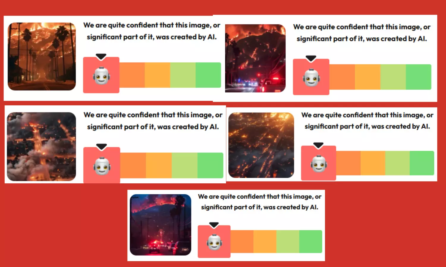 ಮೊದಲ ಕೀಫ್ರೇಮ್ ಸುಡುವ ಪರ್ವತದ ಕಡೆಗೆ ಹೋಗುವ ತಾಳೆ ಮರಗಳಿಂದ ಕೂಡಿದ ರಸ್ತೆಯನ್ನು ತೋರಿಸುತ್ತದೆ, ಎರಡನೆಯದು ಉರಿಯುತ್ತಿರುವ ಬೆಂಕಿಯ ಮಧ್ಯೆ ಟ್ರಾಫಿಕ್ ಲೈಟ್‌ನಲ್ಲಿ ಕಾರುಗಳನ್ನು ನಿಲ್ಲಿಸಿರುವುದನ್ನು ಕಾಣಬಹುದು. ಮೂರನೆಯದು ರಾತ್ರಿಯಲ್ಲಿ ಜ್ವಾಲೆ ಮತ್ತು ಹೊಗೆಯಲ್ಲಿ ಮುಳುಗಿರುವ ನಗರದ ವೈಮಾನಿಕ ನೋಟವನ್ನು ನೋಡಬಹುದು, ನಾಲ್ಕನೆಯದು ಕಟ್ಟಡಗಳು ಮತ್ತು ರಸ್ತೆಗಳಲ್ಲಿ ವ್ಯಾಪಕ ಬೆಂಕಿ ಹರಡಿದಿರುವುದು ತೋರಿಸುತ್ತದೆ. ಐದನೇಯದರಲ್ಲಿ ಜ್ವಾಲೆಯು ಬೆಟ್ಟದ ತುದಿಯನ್ನು ಆವರಿಸಿದೆ. ಅಂತಿಮ ಕೀಫ್ರೇಮ್​ನಲ್ಲಿ ಕಿತ್ತಳೆ ಬಣ್ಣದ ಆಕಾಶದಲ್ಲಿ ಜ್ವಾಲೆಗಳಿಂದ ಮುಳುಗಿರುವ ನಗರವನ್ನು ಕಾಣಬಹುದು. ಈ ಎಲ್ಲಾ ದೃಶ್ಯಗಳು ಎಐ- ರಚಿತವಾದವು ಎಂದು ಪತ್ತೆಹಚ್ಚಲಾಗಿದೆ. (ಇದನ್ನು ಇಲ್ಲಿ , ಇಲ್ಲಿ , ಇಲ್ಲಿ , ಇಲ್ಲಿ , ಇಲ್ಲಿ ಮತ್ತು ಇಲ್ಲಿ ಪರಿಶೀಲಿಸಿ)