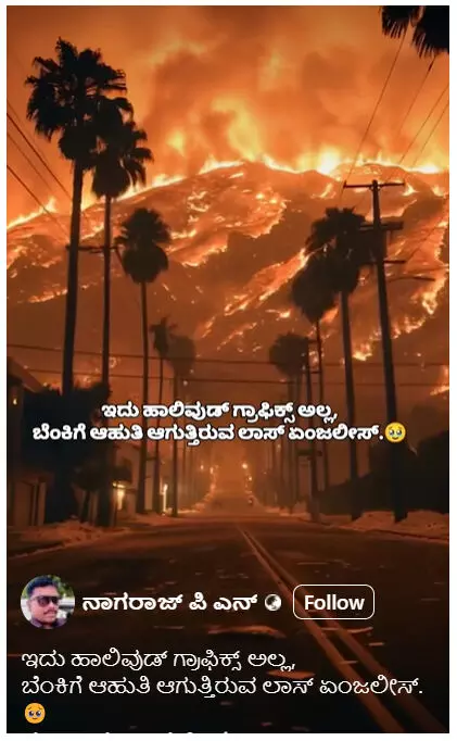 ಫೇಸ್​ಬುಕ್ ಬಳಕೆದಾರರು ವಿಡಿಯೋವೊಂದನ್ನು ಹಂಚಿಕೊಂಡು, ‘‘ಇದು ಹಾಲಿವುಡ್ ಗ್ರಾಫಿಕ್ಸ್ ಅಲ್ಲ, ಬೆಂಕಿಗೆ ಆಹುತಿ ಆಗುತ್ತಿರುವ ಲಾಸ್ ಏಂಜಲೀಸ್’’ ಎಂದು ಬರೆದುಕೊಂಡಿದ್ದರು.