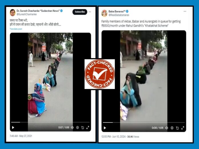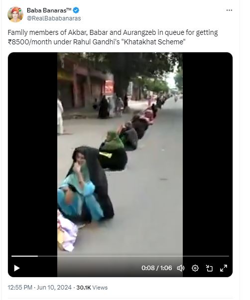 Baba Banaras(@RealBababanaras) ಎಂಬ ಎಕ್ಸ್‌ ಬಳಕೆದಾರ ಬುರ್ಕಾಧಾರಿ ಮಹಿಳೆಯರು ಬ್ಯಾಂಕ್ ಮುಂದೆ ಸರತಿ ಸಾಲಿನಲ್ಲಿ ಕುಳಿತಿದ್ದ ವಿಡಿಯೋವೊಂದನ್ನು ಇತ್ತೀಚೆಗೆ ಹಂಚಿಕೊಂಡು, “ಅಕ್ಬರ್, ಬಾಬರ್ ಮತ್ತು ಔರಂಗಝೇಬ್‌ನ ಕುಟುಂಬ ಸದಸ್ಯರು ರಾಹುಲ್ ಗಾಂಧಿಯವರ “ಕಟಾಕಟ್‌ ಯೋಜನೆ” ಅಡಿಯಲ್ಲಿ ತಿಂಗಳಿಗೆ ಸಿಗುವ 8,500 ರೂಪಾಯಿ ಪಡೆಯಲು ಸರದಿ ಸಾಲಿನಲ್ಲಿ ಕಾಯುತ್ತಿದ್ದಾರೆ ಎಂದು ಬರೆದುಕೊಂಡಿದ್ದರು.
