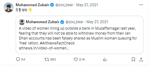 ಸುರೇಶ್ ಚವ್ಹಾಂಕೆ ಹಂಚಿಕೊಂಡಿದ್ದ ವಿಡಿಯೋಗೆ ಕಮೆಂಟ್ ಮಾಡಿದ್ದ ಖ್ಯಾತ ಫ್ಯಾಕ್ಟ್‌ ಚೆಕ್ ಸಂಸ್ಥೆ ಆಲ್ಟ್‌ ನ್ಯೂಸ್‌ನ ಸಹ ಸಂಸ್ಥಾಪಕ ಮೊಹಮ್ಮದ್ ಝುಬೈರ್” “ಕಳೆದ ವರ್ಷ ಮುಝಾಫರ್‌ ನಗರದ ಬ್ಯಾಂಕ್‌ನ ಹೊರಗೆ ಮಹಿಳೆಯರು ತಮ್ಮ ಜನ್ ಧನ್ ಖಾತೆಯಿಂದ ಹಣವನ್ನು ಹಿಂಪಡೆಯಲು ಸಾಧ್ಯವಾಗುವುದಿಲ್ಲ ಎಂಬ ಭಯದಿಂದ ಸರತಿ ಸಾಲಿನಲ್ಲಿ ನಿಂತಿದ್ದ ವಿಡಿಯೋವನ್ನು, ಮುಸ್ಲಿಂ ಮಹಿಳೆಯರು ಉಚಿತ ಪಡಿತರಕ್ಕಾಗಿ ಸರತಿ ಸಾಲಿನಲ್ಲಿ ನಿಂತಿದ್ದಾರೆ ಎಂದು ತಪ್ಪಾಗಿ ಹಂಚಿಕೊಳ್ಳಲಾಗಿದೆ” ಎಂದು ತಿಳಿಸಿದ್ದರು.