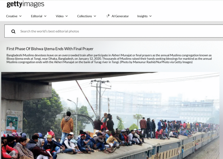 ‘ಗೆಟ್ಟಿ ಇಮೇಜಸ್‘ನಲ್ಲಿ ವೈರಲ್ ವಿಡಿಯೋಗೆ ಸಂಬಂಧಿಸಿದ ಪೋಟೋ ಲಭ್ಯವಾಗಿದ್ದು, ಅದರ ಜೊತೆಗೆ “ಅಂತಿಮ ಪ್ರಾರ್ಥನೆಯೊಂದಿಗೆ ಬಿಶ್ವಾ ಇಜ್ತೆಮಾದ ಮೊದಲ ಹಂತ ಮುಕ್ತಾಯ. ಬಿಸ್ವಾ ಇಜ್ತೆಮಾ ಎಂದು ಕರೆಯಲ್ಪಡುವ ಮುಸ್ಲಿಮರ ವಾರ್ಷಿಕ ಸಭೆ 2020ರ ಜನವರಿ 12 ರಂದು ಬಾಂಗ್ಲಾದೇಶದ ಢಾಕಾ ಬಳಿಯ ಟೋಂಗಿಯಲ್ಲಿ ಕೊನೆಗೊಳ್ಳುವುದರಿಂದ ಬಾಂಗ್ಲಾದೇಶದ ಮುಸ್ಲಿಂ ಭಕ್ತರು ಅಖೇರಿ ಮುನಾಜತ್ ಅಥವಾ ಅಂತಿಮ ಪ್ರಾರ್ಥನೆಯಲ್ಲಿ ಭಾಗವಹಿಸಿದ ನಂತರ ಕಿಕ್ಕಿರಿದ ರೈಲಿನಲ್ಲಿ ಹೊರಡುತ್ತಾರೆ. ಟೋಂಗಿಯ ತುರಾಗ್ ನದಿಯ ದಡದಲ್ಲಿ ಅಖೇರಿ ಮುನಾಜತ್ ನೊಂದಿಗೆ ವಾರ್ಷಿಕ ಮುಸ್ಲಿಮರ ಸಭೆ ಕೊನೆಗೊಳ್ಳುತ್ತಿದ್ದಂತೆ ಸಾವಿರಾರು ಮುಸ್ಲಿಮರು ಮಾನವಕುಲದ ಆಶೀರ್ವಾದಕ್ಕಾಗಿ ಕೈ ಎತ್ತಿದರು” ಎಂದು ಬರೆದುಕೊಳ್ಳಲಾಗಿದೆ.