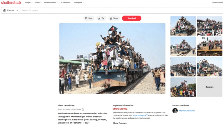 ‘ಶಟರ್ ಸ್ಟಾಕ್‘ ಎಂಬ ಇನ್ನೊಂದು ಪೋಟೋ ವೆಬ್ಸೈಟ್ನಲ್ಲಿ ವೈರಲ್ ವಿಡಿಯೋಗೆ ಸಂಬಂಧಿಸಿದ ಫೋಟೋ ದೊರೆತಿದ್ದು, “ಫೆಬ್ರವರಿ 11, 2024 ರಂದು ಬಾಂಗ್ಲಾದೇಶದ ಢಾಕಾದಲ್ಲಿರುವ ಟೋಂಗಿಯಲ್ಲಿರುವ ಬಿಸ್ವಾ ಇಜ್ತೆಮಾದಲ್ಲಿ ಅಖೇರಿ ಮುನಾಜತ್ ಅಥವಾ ಎರಡನೇ ಹಂತದ ಅಂತಿಮ ಪ್ರಾರ್ಥನೆಯಲ್ಲಿ ಭಾಗವಹಿಸಿದ ನಂತರ ಮುಸ್ಲಿಂ ಭಕ್ತರು ಕಿಕ್ಕಿರಿದ ರೈಲಿನಲ್ಲಿ ಹೊರಡುತ್ತಾರೆ” ಎಂದು ಬರೆಯಲಾಗಿದೆ.