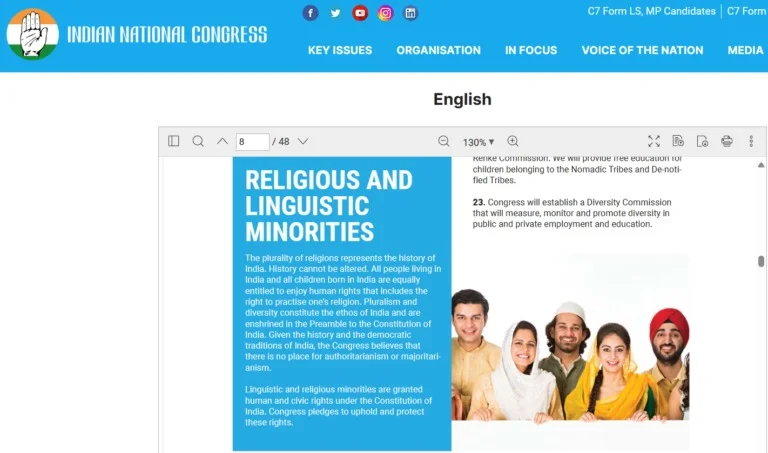 ಇದಕ್ಕಾಗಿ ನಾವು, ಕಾಂಗ್ರೆಸ್ ಬಿಡುಗಡೆ ಮಾಡಿರುವ ಲೋಕಸಭೆ ಚುನಾವಣೆಯ ಪ್ರಣಾಳಿಕೆಯನ್ನು ಪರಿಶೀಲಿಸಿದ್ದೇವೆ. ಕಾಂಗ್ರೆಸ್ ಅಧಿಕೃತ ವೆಬ್ಸೈಟ್ನಲ್ಲಿರುವ ಪ್ರಣಾಳಿಕೆಯ 7 ಮತ್ತು 8ನೇ ಪುಟಗಳಲ್ಲಿ ‘ಭಾಷೆ ಮತ್ತು ಧಾರ್ಮಿಕ ಅಲ್ಪ ಸಂಖ್ಯಾತರಿಗೆ’ ಸಂಬಂಧಪಟ್ಟಂತೆ ಭರವಸೆಗಳನ್ನು ನೀಡಲಾಗಿದೆ. ಅವುಗಳು ಹೀಗಿವೆ..