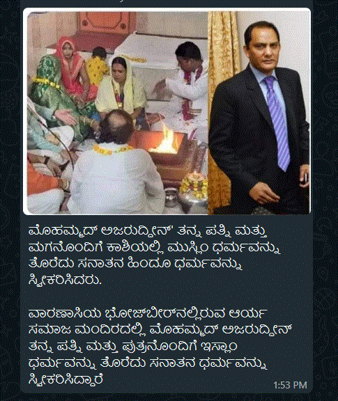 ಮಾಜಿ ಕ್ರಿಕೆಟಿಗ ಮೊಹಮ್ಮದ್ ಅಝರುದ್ದೀನ್ ತನ್ನ ಪತ್ನಿ ಮಗನೊಂದಿಗೆ ಇಸ್ಲಾಂ ಧರ್ಮ ತೊರೆದು ಹಿಂದೂ ಧರ್ಮ ಸ್ವೀಕರಿಸಿದ್ದಾರೆ ಎಂಬ ಸಂದೇಶವೊಂದು ಕೆಲ ದಿನಗಳಿಂದ ಸಾಮಾಜಿಕ ಜಾಲತಾಣಗಳಲ್ಲಿ ಹರಿದಾಡುತ್ತಿದೆ.