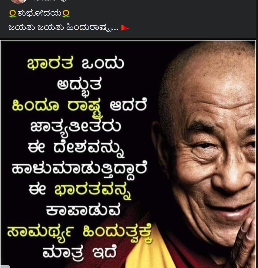 ಭಾರತವು ಶ್ರೇಷ್ಠ ಹಿಂದೂ ರಾಷ್ಟ್ರವಾಗಿದೆ, ಆದರೆ ಜಾತ್ಯತೀತತೆಯು ಭಾರತವನ್ನು ಮತ್ತು ಅದರ ಶ್ರೇಷ್ಠತೆಯನ್ನು ನಾಶಪಡಿಸುತ್ತಿದೆ. ಹಿಂದುತ್ವದಿಂದ ಮಾತ್ರ ಭಾರತವನ್ನು ಉಳಿಸಲು ಸಾಧ್ಯ” ಎಂದು ದಲೈಲಾಮಾರವರು ಹೇಳಿದ್ದಾರೆ ಎಂದು ಸಾಮಾಜಿಕ ಜಾಲತಾಣಗಳಲ್ಲಿ ಪೋಸ್ಟ್ ಒಂದನ್ನು ಹಂಚಿಕೊಳ್ಳಲಾಗುತ್ತಿದೆ. ಇದು ನಿಜವೇ ಎಂಬುದನ್ನು ಪರಿಶೀಲಿಸೋಣ.