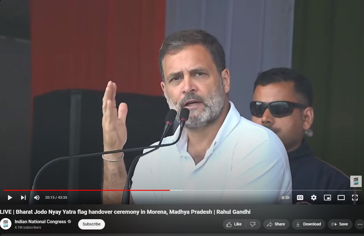 ಈ ವಿಡಿಯೋ ಮಾರ್ಚ್ 2,2024ರಂದು ಮಧ್ಯಪ್ರದೇಶದ ಮೊರೆನಾದಲ್ಲಿ ಭಾರತ್ ಜೋಡೋ ನ್ಯಾಯ ಯಾತ್ರೆಯ ಪುನರಾರಂಭದ ವೇಳೆ ಸಾರ್ವಜನಿಕರನ್ನು ಉದ್ದೇಶಿಸಿ ರಾಹುಲ್ ಗಾಂಧಿ ಮಾಡಿರುವ ಭಾಷಣದ್ದು ಎಂದು ತಿಳಿದು ಬಂದಿದೆ.