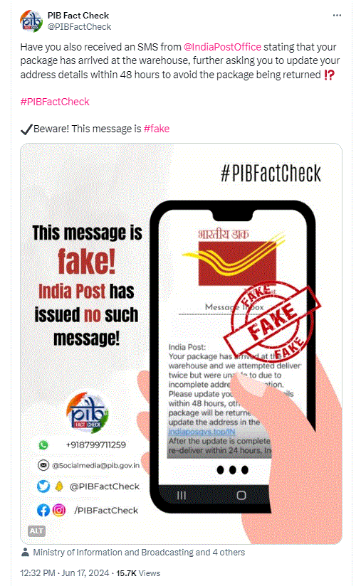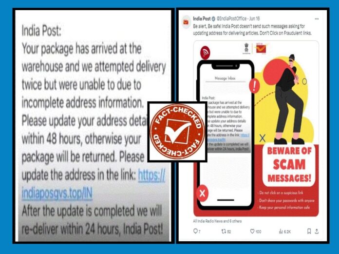 ಫ್ಯಾಕ್ಟ್‌ ಚೆಕ್ : ಅಂಚೆ ಇಲಾಖೆಯ ಹೆಸರಿನಲ್ಲಿ ಮೊಬೈಲ್‌ಗೆ ಬರುತ್ತಿರುವ ಸಂದೇಶ ನಕಲಿ (ಫೇಕ್) ಎಂದು ಸರ್ಕಾರದ ಅಧಿಕೃತ ಸಂಸ್ಥೆ ಪ್ರೆಸ್‌ ಇನ್ಫರ್ಮೇಶನ್ ಬ್ಯೂರೋ (ಪಿಐಬಿ) ಖಚಿತಪಡಿಸಿದೆ.