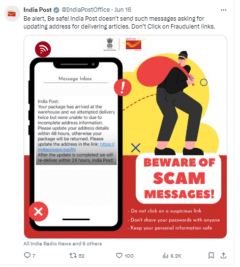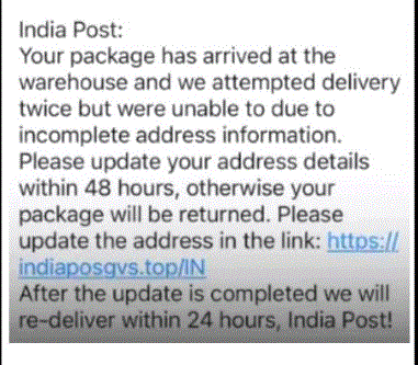 “ನಿಮ್ಮ ಪಾರ್ಸೆಲ್ ಗೋದಾಮಿನಲ್ಲಿ ಡೆಲಿವರಿಗಾಗಿ ಕಾಯ್ತಿದೆ. ಹಲವಾರು ಬಾರಿ ಡೆಲಿವರಿ ಮಾಡಲು ಪ್ರಯತ್ನಿಸಿದರೂ, ತಪ್ಪಾದ ವಿಳಾಸದ ಕಾರಣ ಸಾಧ್ಯವಾಗಿಲ್ಲ. ದಯವಿಟ್ಟು ಕೆಳಗಿನ ಲಿಂಕ್ ಒತ್ತಿ, ನಿಮ್ಮ ಮಾಹಿತಿಯನ್ನು ಅಪ್ಡೇಡ್ ಮಾಡಿ. 24 ಗಂಟೆಯೊಳಗೆ ಡೆಲಿವರಿ ಮಾಡಲಾಗುವುದು” ಎಂಬ ಸಂದೇಶವೊಂದು ಭಾರತೀಯ ಅಂಚೆಯ ಹೆಸರಿನಲ್ಲಿ ಅನೇಕ ಜನರ ಮೊಬೈಲ್‌ಗೆ ಬರುತ್ತಿವೆ.