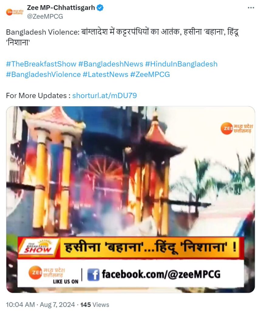 ‘ಝೀ ನ್ಯೂಸ್ ಮಧ್ಯಪ್ರದೇಶ ಮತ್ತು ಛತ್ತೀಸ್ಗಢ, ನ್ಯೂಸ್ 24 ಹಿಂದಿ‘ ಸೇರಿದಂತೆ ಕೆಲ ಮಾಧ್ಯಮಗಳು ತಮ್ಮ ವರದಿಗಳಲ್ಲಿ ವಿಡಿಯೋ, ಫೋಟೋ ಹಂಚಿಕೊಂಡಿವೆ. ಸಾಮಾಜಿಕ ಜಾಲತಾಣ ಬಳಕೆದಾರರು ವಿಡಿಯೋ ಹಂಚಿಕೊಂಡು “ಹಿಂದೂ ದೇವಸ್ಥಾನಕ್ಕೆ ಬೆಂಕಿ ಹಚ್ಚಲಾಗಿದೆ” ಎಂದಿದ್ದಾರೆ.
