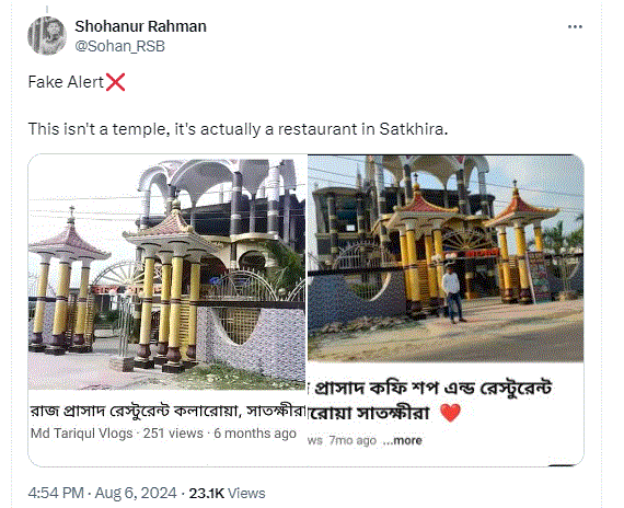 ಬಾಂಗ್ಲಾದೇಶದ ಫ್ಯಾಕ್ಟ್ಚೆಕ್ಕರ್ ಸೊಹಾನುರ್ ರಹಮಾನ್ ಆಗಸ್ಟ್ 6,2024ರಂದು ಈ ಕುರಿತು ಎಕ್ಸ್ನಲ್ಲಿ ಪೋಸ್ಟ್ವೊಂದನ್ನು ಹಾಕಿದ್ದಾರೆ. ಆ ಪೋಸ್ಟ್ನಲ್ಲಿ ವೈರಲ್ ವಿಡಿಯೋದಲ್ಲಿರುವ ಕಟ್ಟಡ ಸಂಬಂಧಿತ ಎರಡು ಸ್ಕ್ರೀನ್ ಶಾಟ್ಗಳಿವೆ. ಸ್ಕ್ರೀನ್ ಶಾಟ್ನಲ್ಲಿ ‘রাজ প্রাসাদ কফি শপ এন্ড রেস্টুরেন্ট কলারোয়া সাতক্ষীরা’(ರಾಜ್ ಪ್ರಸಾದ್ ಕಾಫಿ ಶಾಪ್ & ರೆಸ್ಟೋರೆಂಟ್ ಕಲೋರ ಸತಿಖ್ರಾ) ಎಂದು ಬರೆಯಲಾಗಿದೆ. ಇದು ದೇವಸ್ಥಾನವಲ್ಲ, ಸತಿಖ್ರಾದ ರೆಸ್ಟೋರೆಂಟ್ ಎಂದು ಸೊಹಾನುರ್ ರಹಮಾನ್ ಕೂಡ ಬರೆದುಕೊಂಡಿದ್ದಾರೆ.