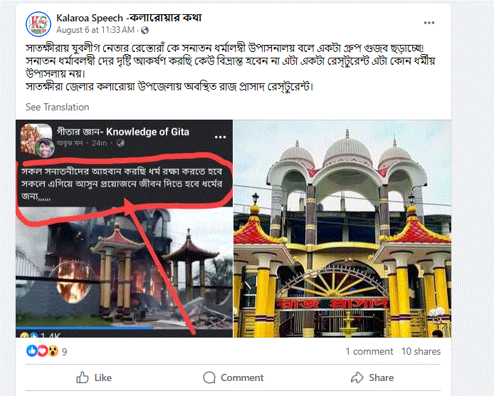 ಕಲೋರಾ ಸ್ಪೀಚ್ ಎಂಬ ಫೇಸ್ಬುಕ್ ಪೇಜೊಂದರಲ್ಲಿ ಆಗಸ್ಟ್ 6, 2024ರಂದು ಹಾಕಿರುವ ಪೋಸ್ಟ್ನಲ್ಲೂ ವೈರಲ್ ವಿಡಿಯೋದ ಸ್ಕ್ರೀನ್ಶಾಟ್ ಮತ್ತು ಮೇಲೆ ನಾವು ಹೆಸರಿಸಿದ ರೆಸ್ಟೋರೆಂಟ್ನ ಫೋಟೋ ಹಂಚಿಕೊಳ್ಳಲಾಗಿದ್ದು, “ವೈರಲ್ ವಿಡಿಯೋದಲ್ಲಿ ಹೊತ್ತಿ ಉರಿಯುತ್ತಿರುವ ಕಟ್ಟಡ ದೇವಸ್ಥಾನವಲ್ಲ” ಎಂದು ಖಚಿತಪಡಿಸಲಾಗಿದೆ.