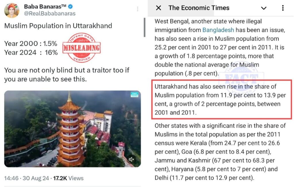ಉತ್ತರಾಖಂಡದಲ್ಲಿ 2000 ಇಸವಿಯಲ್ಲಿ 1.5% ರಷ್ಟಿದ್ದ ಮುಸ್ಲಿಮರ ಜನಸಂಖ್ಯೆ 2024ರ ಹೊತ್ತಿಗೆ 16 % ರಷ್ಟು ಗಣನೀಯವಾಗಿ ಹೆಚ್ಚಳವಾಗಿದೆ ಎಂದು ಸಾಮಾಜಿಕ ಮಾಧ್ಯಮಗಳಲ್ಲಿ ವಿಡಿಯೋವೊಂದು ಹರಿದಾಡುತ್ತಿದೆ. ‘ಎಚ್ಚರಿಕೆಯ ಕರೆಗಂಟೆ’ ಎಂದು ಮುಸ್ಲಿಮರನ್ನು ಗುರಿಯಾಗಿಸಿ ವಿಡಿಯೋವನ್ನು ಎಕ್ಸ್ ನಲ್ಲಿ ಹಂಚಿಕೊಳ್ಳಲಾಗುತ್ತಿದೆ.