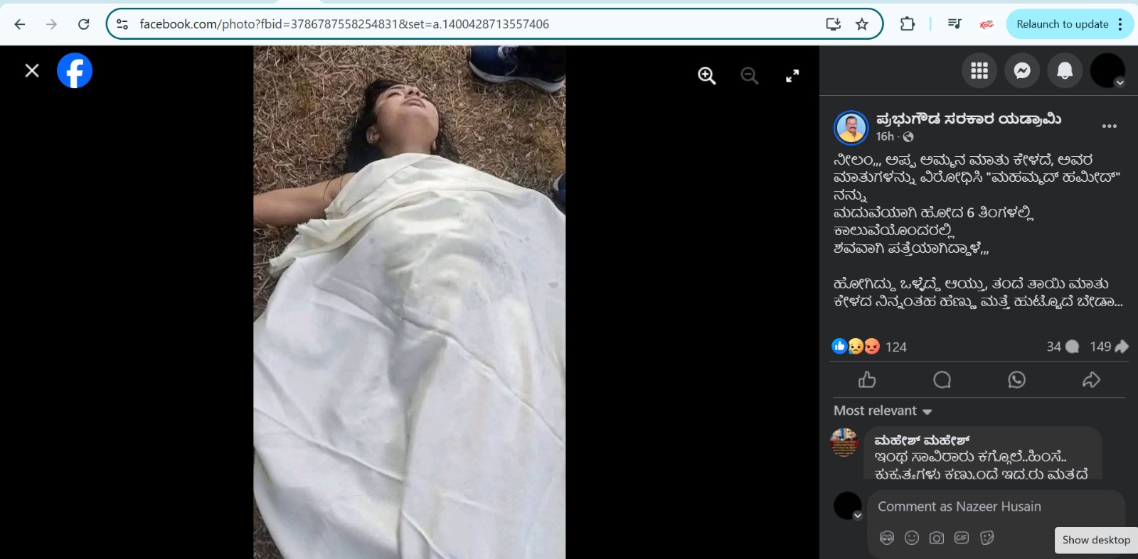 ಯುವತಿಯೊಬ್ಬರ ಮೃತದೇಹವೊಂದರ ಚಿತ್ರದೊಂದಿಗೆ, ಮುಸ್ಲಿಂ ಪ್ರೇಮಿ ಈ ಯುವತಿಯನ್ನು ಕೊಂದಿದ್ದಾರೆ ಎಂದು ಪ್ರತಿಪಾದಿಸಿ ಬಿಜೆಪಿ ಬೆಂಬಲಿಗರು ವಾಟ್ಸಪ್, ಫೇಸ್‌ಬುಕ್, ಟ್ವಿಟರ್, ಇನ್ಸ್‌ಟಾಗ್ರಾಮ್ ಸೇರಿದಂತೆ ಸಾಮಾಜಿಕ ಮಾಧ್ಯಮಗಳಲ್ಲಿ ವೈರಲ್ ಮಾಡುತ್ತಿದ್ದಾರೆ. ಯುವತಿಯ ಮೃತದೇಹದ ಚಿತ್ರದೊಂದಿಗೆ,  [ ನೀಲಂ,,, ಅಪ್ಪ ಅಮ್ಮನ ಮಾತು ಕೇಳದೆ, ಅವರ ಮಾತುಗಳನ್ನು ವಿರೋಧಿಸಿ “ಮಹಮ್ಮದ್ ಹಮೀದ್” ನನ್ನು ಮದುವೆಯಾಗಿ ಹೋದ 6 ತಿಂಗಳಲ್ಲಿ ಕಾಲುವೆಯೊಂದರಲ್ಲಿ ಶವವಾಗಿ ಪತ್ತೆಯಾಗಿದ್ದಾಳೆ,,,] ಎಂಬ ಹೇಳಿಕೆಯನ್ನು ವೈರಲ್ ಮಾಡುತ್ತಿದ್ದಾರೆ. Fact Check | The girl was killed by her boyfriend Yuvraj Singh, not Mohammad Hameed