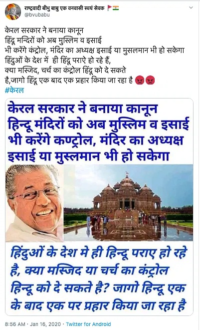 “ಕೇರಳ ಸರ್ಕಾರವು ಹೊಸ ಕಾನೂನನ್ನು ತಂದಿದ್ದು, ಅದರಂತೆ ಹಿಂದೂ ದೇವಾಲಯಗಳನ್ನು ಮುಸ್ಲಿಮರು ಹಾಗೂ ಕ್ರಿಸ್ಚಿಯನ್ನರು ನಿಯಂತ್ರಿಸಬಹುದು, ಮಂದಿರದ ಮುಖ್ಯಸ್ಥರಾಗಿ ಮುಸ್ಲಿಮರು ಅಥವಾ ಕ್ರಿಸ್ಚಿಯನ್ನರು ಕೂಡಾ ಇರಬಹುದು” ಎಂಬ ಬರಹವಿರುವ ಚಿತ್ರಗಳು ಹರಿದಾಡುತ್ತಿದೆ.