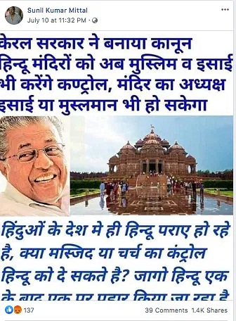 ಕೇರಳ ಸರ್ಕಾರವು ಹೊಸ ಕಾನೂನನ್ನು ತಂದಿದ್ದು, ಅದರಂತೆ ಹಿಂದೂ ದೇವಾಲಯಗಳನ್ನು ಮುಸ್ಲಿಮರು ಹಾಗೂ ಕ್ರಿಸ್ಚಿಯನ್ನರು ನಿಯಂತ್ರಿಸಬಹುದು, ಮಂದಿರದ ಮುಖ್ಯಸ್ಥರಾಗಿ ಮುಸ್ಲಿಮರು ಅಥವಾ ಕ್ರಿಸ್ಚಿಯನ್ನರು ಕೂಡಾ ಇರಬಹುದು ಎಂಬ ಬರಹವಿರುವ ಚಿತ್ರಗಳು ಸಾಮಾಜಿಕ ಜಾಲತಾಣದಲ್ಲಿ ಹರಿದಾಡುತ್ತಿದೆ.
