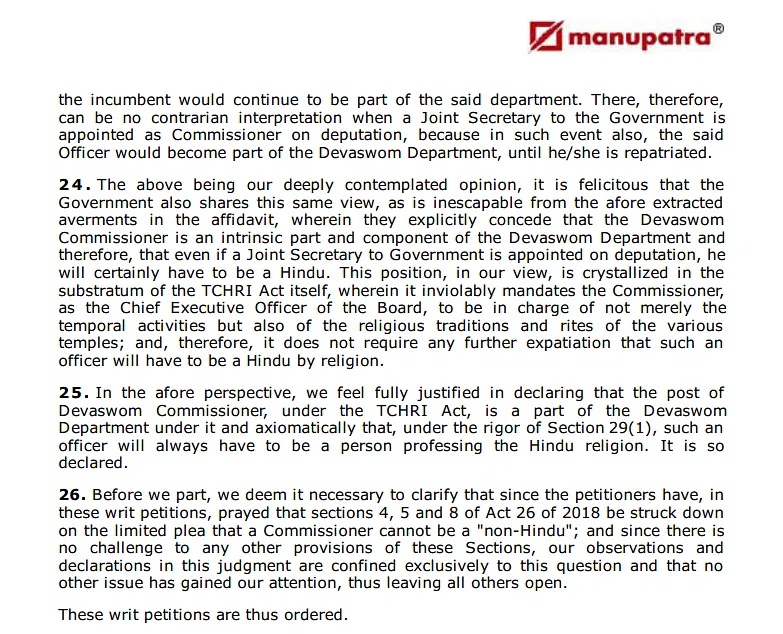 ತಿರುವಾಂಕೂರು-ಕೊಚ್ಚಿನ್ ಹಿಂದೂ ಧಾರ್ಮಿಕ ಸಂಸ್ಥೆಗಳ ಕಾಯ್ದೆ 1950 ರ ಸೆಕ್ಷನ್ 29 (1), ದೇವಸ್ವಂ ಇಲಾಖೆಯು ಹಿಂದೂ ಅಧಿಕಾರಿಗಳನ್ನು ಒಳಗೊಂಡಿರಬೇಕು ಎಂದು ಹೇಳಿದೆ.