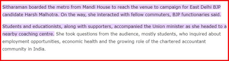 ಈ ಬಗ್ಗೆ ಮತ್ತಷ್ಟು ಸರ್ಚ್ ಮಾಡಿದಾಗ, ಮೇ 17ರಂದು ಟೈಮ್ಸ್‌ ಆಫ್‌ ಇಂಡಿಯಾ ಪ್ರಕಟಿಸಿದ ವರದಿಯೊಂದು ಲಭ್ಯವಾಗಿದೆ. ಆ ವರದಿಯಲ್ಲಿ “ಪೂರ್ವ ದೆಹಲಿ ಬಿಜೆಪಿ ಅಭ್ಯರ್ಥಿ ಹರ್ಷ್ ಮಲ್ಹೋತ್ರಾ ಪರ ಪ್ರಚಾರ ಮಾಡಲು ಸೀತಾರಾಮನ್ ಮಂಡಿ ಹೌಸ್‌ನಿಂದ ಮೆಟ್ರೋದಲ್ಲಿ ಸಂಚರಿಸಿದರು ಎಂದು ಉಲ್ಲೇಖಿಸಲಾಗಿದೆ.  ಪ್ರಯಾಣದ ಸಂದರ್ಭದಲ್ಲಿ ಅವರು ಸಹ ಪ್ರಯಾಣಿಕರೊಂದಿಗೆ ಸಂವಾದ ನಡೆಸಿದರು ಎಂದು ಬಿಜೆಪಿ ಪದಾಧಿಕಾರಿಗಳು ಹೇಳಿದ್ದಾರೆ. ಬಳಿಕ ಹಣಕಾಸು ಸಚಿವರು ಸಮೀಪದ ಕೋಚಿಂಗ್ ಸೆಂಟರ್‌ಗೆ ಭೇಟಿ ನೀಡಿದರು, ಅಲ್ಲಿ ಅವರು ಪ್ರಾಥಮಿಕವಾಗಿ ಉದ್ಯೋಗಾವಕಾಶಗಳು, ಆರ್ಥಿಕತೆಯ ಸ್ಥಿತಿ ಮತ್ತು ಭಾರತದಲ್ಲಿ ಚಾರ್ಟರ್ಡ್ ಅಕೌಂಟೆಂಟ್‌ಗಳ ಪಾತ್ರಗಳ ಕುರಿತು ವಿದ್ಯಾರ್ಥಿಗಳ ಪ್ರಶ್ನೆಗಳಿಗೆ ಉತ್ತರಿಸಿದರು” ಎಂದು ವರದಿಯಲ್ಲಿ ಉಲ್ಲೇಖಿಸಲಾಗಿದೆ.