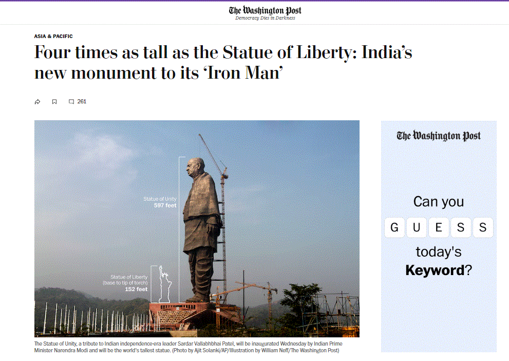 ಸುಮಾರು 562 ರಾಜ ಪ್ರಭುತ್ವಗಳಲ್ಲಿ ಹಂಚಿಹೋಗಿದ್ದ ಭಾರತವನ್ನು ಸ್ವಾತಂತ್ರ್ಯದ ಬಳಿಕ ಒಂದೇ ಒಕ್ಕೂಟದಡಿ ತಂದ ಕೀರ್ತಿ ಸರ್ದಾರ್ ಪಟೇಲರಿಗೆ ಸಲ್ಲುತ್ತದೆ. ಅಂತಹ ಪಟೇಲರ 143ನೇ ಜನ್ಮ ದಿನವಾದ ಅಕ್ಟೋಬರ್ 31, 2018ರಂದು ಪ್ರಧಾನಿ ನರೇಂದ್ರ ಮೋದಿಯವರು ‘ಏಕತಾ ಪ್ರತಿಮೆ’ಯನ್ನು ಲೋಕಾರ್ಪಣೆಗೊಳಿಸಿದ್ದಾರೆ.