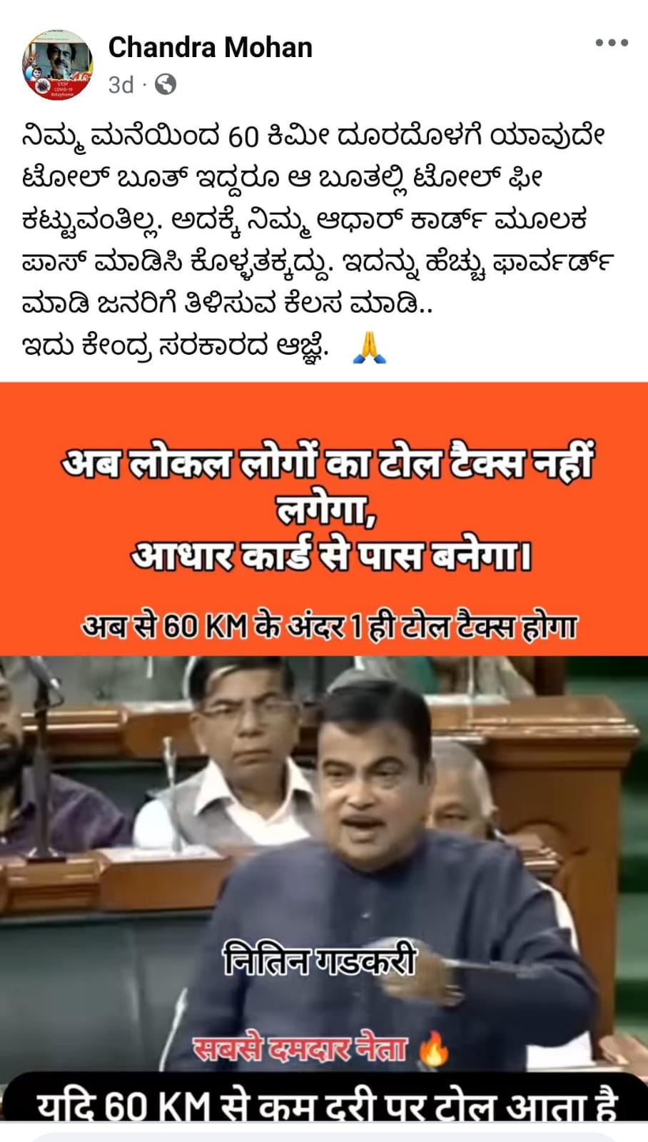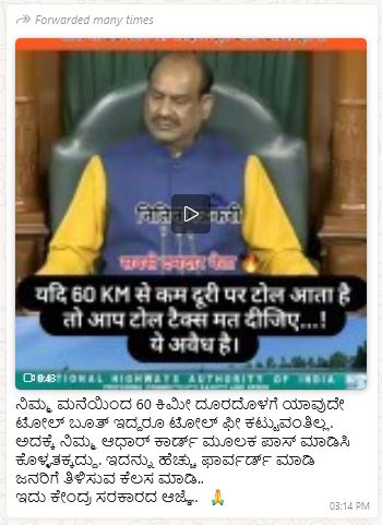 ವಾಟ್ಸಾಪ್ ನಲ್ಲಿ ಕಂಡು ಬಂದ ಮೆಸೇಜ್ನಲ್ಲಿ “ನಿಮ್ಮ ಮನೆಯಿಂದ 60 ಕಿಮೀ ದೂರದೊಳಗೆ ಯಾವುದೇ ಟೋಲ್ ಬೂತ್ ಇದ್ದರೂ ಆ ಬೂತಲ್ಲಿ ಟೋಲ್ ಫೀ ಕಟ್ಟುವಂತಿಲ್ಲ. ಅದಕ್ಕೆ ನಿಮ್ಮ ಆಧಾರ್ ಕಾರ್ಡ್ ಮೂಲಕ ಪಾಸ್ ಮಾಡಿಸಿಕೊಳ್ಳತಕ್ಕದ್ದು. ಇದನ್ನು ಹೆಚ್ಚು ಫಾರ್ವರ್ಡ್ ಮಾಡಿ ಜನರಿಗೆ ತಿಳಿಸುವ ಕೆಲಸ ಮಾಡಿ. ಇದು ಕೇಂದ್ರ ಸರಕಾರದ ಆಜ್ಞೆ” ಎಂದು ಬರೆಯಲಾಗಿದೆ. ಜೊತೆಗೆ ವಿಡಿಯೋ ಹಂಚಿಕೊಳ್ಳಲಾಗಿದೆ.