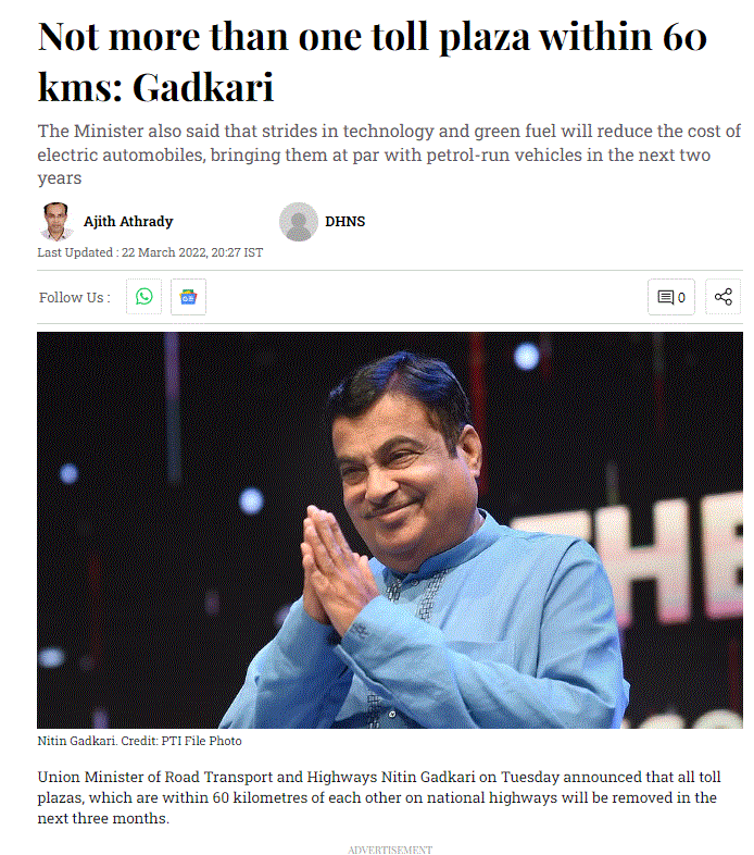 ಮಾರ್ಚ್ 22, 2023ರಂದು ಪ್ರಕಟಗೊಂಡ ದಿ ಹಿಂದೂ ವರದಿಯಲ್ಲಿ, “ರಾಷ್ಟ್ರೀಯ ಹೆದ್ದಾರಿಗಳಲ್ಲಿ 60 ಕಿ.ಮೀ ದೂರಕ್ಕೆ ಒಂದೇ ಟೋಲ್ ಪ್ಲಾಝಾ ಇರಲಿದ್ದು, ಒಂದಕ್ಕಿಂತ ಹೆಚ್ಚು ಟೋಲ್ ಪ್ಲಾಝಾಗಳಿದ್ದರೆ ಮುಂದಿನ ಮೂರು ತಿಂಗಳಲ್ಲಿ ಅಂತವುಗಳನ್ನು ಮುಚ್ಚಲಾಗುವುದು ಎಂದು ಕೇಂದ್ರ ಸಾರಿಗೆ ಸಚಿವ ನಿತಿನ್ ಗಡ್ಕರಿ ಮಂಗಳವಾರ ಲೋಕಸಭೆಯಲ್ಲಿ ಘೋಷಿಸಿದ್ದಾರೆ” ಎಂದಿದೆ.