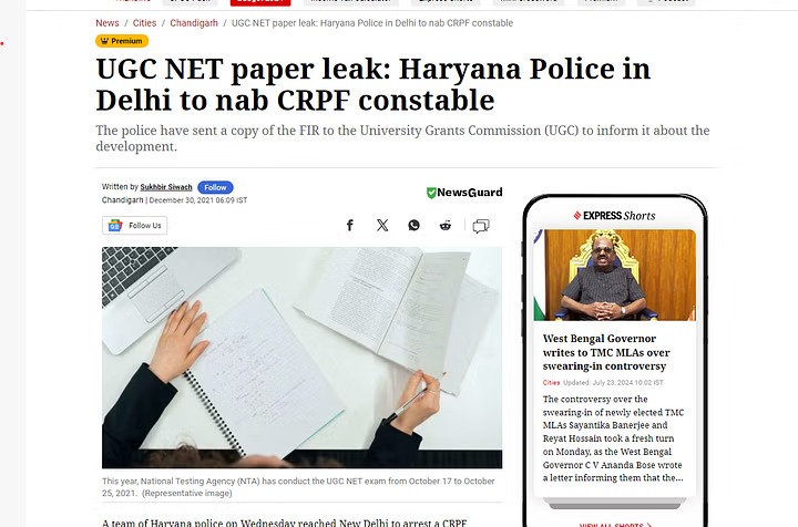 ಯುಜಿಸಿ-ನೆಟ್ ಹಿಂದಿ ಪ್ರಶ್ನೆ ಪತ್ರಿಕೆ 2021: ಡಿಸೆಂಬರ್ 26, 2021ರಂದು ನಡೆದ ಯುಜಿಸಿ-ನೆಟ್ ಹಿಂದಿ ಪರೀಕ್ಷೆಯ ಪ್ರಶ್ನೆ ಪತ್ರಿಕೆ ಸೋರಿಕೆಯಾಗಿತ್ತು. ಹರಿಯಾಣ ಪೊಲೀಸರ ತಂಡವು ಈ ಪ್ರಕರಣ ಸಂಬಂಧ ಸಿಆರ್‌ಪಿಎಫ್‌ ಕಾನ್‌ಸ್ಟೇಬಲ್ ಒಬ್ಬರನ್ನು ಬಂಧಿಸಲು ಪ್ರಯತ್ನಿಸುತ್ತಿದೆ ಎಂದು ಡಿಸೆಂಬರ್ 30, 2021ರಂದು ಇಂಡಿಯಾ ಟುಡೇ ವರದಿ ಮಾಡಿತ್ತು.
