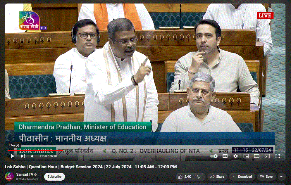 ಜುಲೈ 22ರಂದು ಲೋಕಸಭೆಯಲ್ಲಿ ಮಾತನಾಡಿದ್ದ ಪ್ರಧಾನ್ “ಗೌರವಾನ್ವಿತ ಸದಸ್ಯರು ಕಳೆದ 7 ವರ್ಷಗಳಲ್ಲಿ 70 ಬಾರಿ ಪ್ರಶ್ನೆ ಪತ್ರಿಕೆಗಳು ಸೋರಿಕೆಯಾಗಿರುವ ಕುರಿತು ಪ್ರಶ್ನೆ ಎತ್ತಿದ್ದಾರೆ. ಸರ್, ಸಂಪೂರ್ಣ ಜವಾಬ್ದಾರಿಯೊಂದಿಗೆ ನಾನು ಸದನಕ್ಕೆ ಹೇಳುತ್ತಿದ್ದೇನೆ, ಕಳೆದ 7 ವರ್ಷಗಳಲ್ಲಿ ಯಾವುದೇ ಪ್ರಶ್ನೆ ಪತ್ರಿಕೆಗಳು ಸೋರಿಕೆಯಾಗಿರುವುದಕ್ಕೆ ಪುರಾವೆಗಳಿಲ್ಲ. ನೀಟ್ ಪ್ರಶ್ನೆ ಪತ್ರಿಕೆ ಸೋರಿಕೆಯಾಗಿರುವ ಆರೋಪ ಪ್ರಕರಣ ಸುಪ್ರೀಂ ಕೋರ್ಟ್‌ನಲ್ಲಿದೆ. ತೀರ್ಪು ಬಂದ ಮೇಲೆ ಈ ಬಗ್ಗೆ ಗೊತ್ತಾಗಲಿದೆ” ಎಂದಿದ್ದರು.
