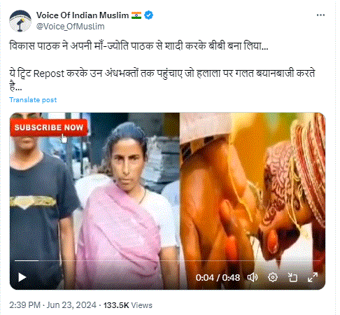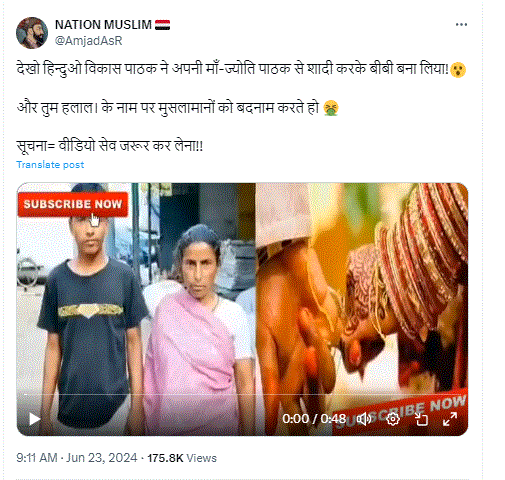 @AmjadAsR ಎಂಬ ಎಕ್ಸ್ ಖಾತೆಯಲ್ಲಿ ವಿಡಿಯೋ ಹಂಚಿಕೊಂಡು “ತಾಯಿ ಮಗನ ನಡುವಿನ ಆಪಾದಿತ ಅನೈತಿಕವಾದ ಮದುವೆ ಗಮನ ಸೆಳೆದಿದೆ. ಇದೇ ರೀತಿಯ ಆರೋಪದ ಆಧಾರದ ಮೇಲೆ ಮುಸ್ಲಿಮರನ್ನು ದೂಷಿಸುವ ಹಿಂದೂಗಳ ಬೂಟಾಟಿಕೆಯನ್ನು ಎತ್ತಿ ತೋರಿಸುತ್ತದೆ”.