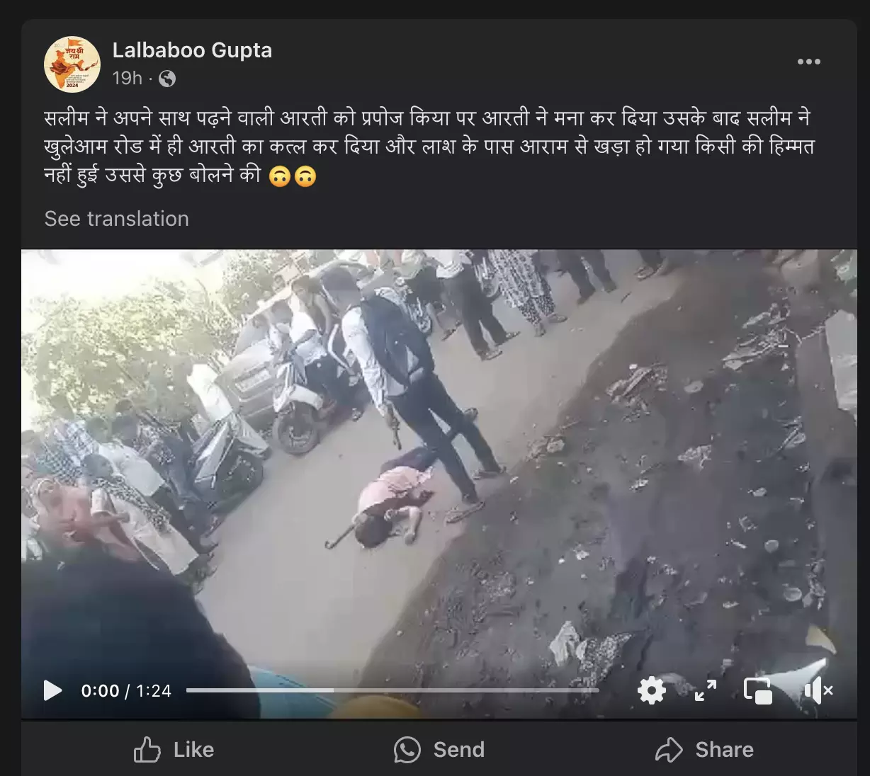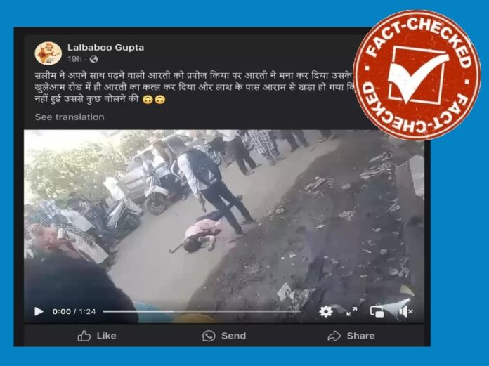 ಜನನಿಬಿಡ ರಸ್ತೆಯ ಮಧ್ಯದಲ್ಲಿ ಯುವತಿಯ ಶವದ ಬಳಿ ಯುವಕನೊಬ್ಬ ನಿಂತಿರುವ ವಿಡಿಯೋವನ್ನು ಸಾಮಾಜಿಕ ಜಾಲತಾಣಗಳಲ್ಲಿ ಹಂಚಿಕೊಂಡಿರುವ ಅನೇಕರು, ಸಲೀಂ ಎಂಬ ಮುಸ್ಲಿಂ ಯುವಕ ಆರತಿ ಎಂಬ ಹಿಂದೂ ಹುಡುಗಿಯನ್ನು ಕೊಲೆ ಮಾಡಿದ್ದಾನೆ ಎಂದು ಬರೆದುಕೊಂಡಿದ್ದಾರೆ.