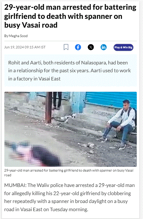 ಜೂನ್ 18, 2024ರಂದು ಬೆಳಿಗ್ಗೆ 8:30ರ ಸುಮಾರಿಗೆ ಮಹಾರಾಷ್ಟ್ರದ ಪಾಲ್ಘರ್ ಜಿಲ್ಲೆಯ ಪೂರ್ವ ವಾಸಿ ಪ್ರದೇಶದ ಚಿಂಚ್ಪಾಡದಲ್ಲಿ ಯುವತಿಯ ಹತ್ಯೆ ಘಟನೆ ನಡೆದಿದೆ. ಆರೋಪಿ 29 ವರ್ಷದ ರೋಹಿತ್ ಯಾದವ್ ಮತ್ತು ಮೃತ ಯುವತಿ 22 ವರ್ಷದ ಆರತಿ ಯಾದವ್ ಎಂದು ತಿಳಿದು ಬಂದಿದೆ.