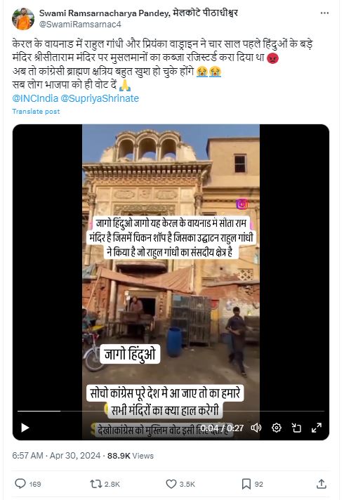 ಕಾಂಗ್ರೆಸ್ ನಾಯಕ ರಾಹುಲ್ ಗಾಂಧಿ ಪ್ರತಿನಿಧಿಸುವ ಕೇರಳದ ವಯನಾಡ್ನ ಕ್ಷೇತ್ರ ವ್ಯಾಪ್ತಿಯ ಐತಿಹಾಸಿಕ ದೇವಸ್ಥಾನವೊಂದರಲ್ಲಿ ಕೋಳಿ ಅಂಗಡಿ (ಚಿಕನ್ ಶಾಪ್) ತೆರೆಯಲಾಗಿದೆ ಎಂದು ಸಾಮಾಜಿಕ ಜಾಲತಾಣಗಳಲ್ಲಿ ವಿಡಿಯೋವೊಂದು ಹರಿದಾಡುತ್ತಿದೆ.
