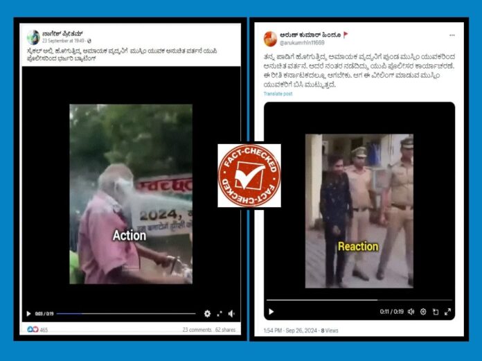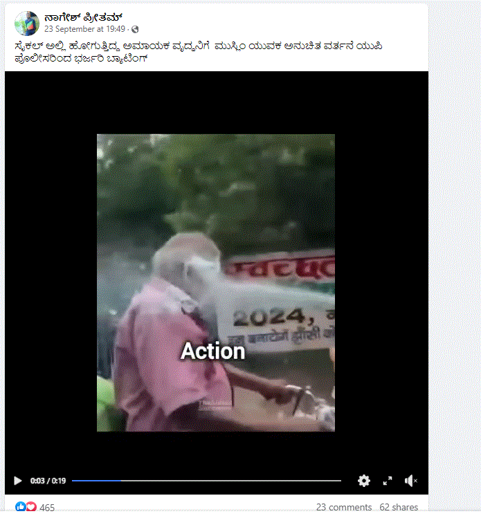ನಾಗೇಶ್ ಪ್ರೀತಮ್ ಎಂಬವರು ಸೆಪ್ಟೆಂಬರ್ 24ರಂದು ತನ್ನ ಫೇಸ್‌ಬುಕ್ ಖಾತೆಯಲ್ಲಿ ವಿಡಿಯೋ ಹಂಚಿಕೊಂಡು ” ಸೈಕಲ್‌ ಅಲ್ಲಿ ಹೋಗುತ್ತಿದ್ದ ಅಮಾಯಕ ವೃದ್ದನಿಗೆ ಮುಸ್ಲಿಂ ಯುವಕ ಅನುಚಿತ ವರ್ತನೆ ಯುಪಿ ಪೊಲೀಸರಿಗೆ ಭರ್ಜರಿ ಬ್ಯಾಟಿಂಗ್” ಎಂದು ಬರೆದುಕೊಂಡಿದ್ದರು.