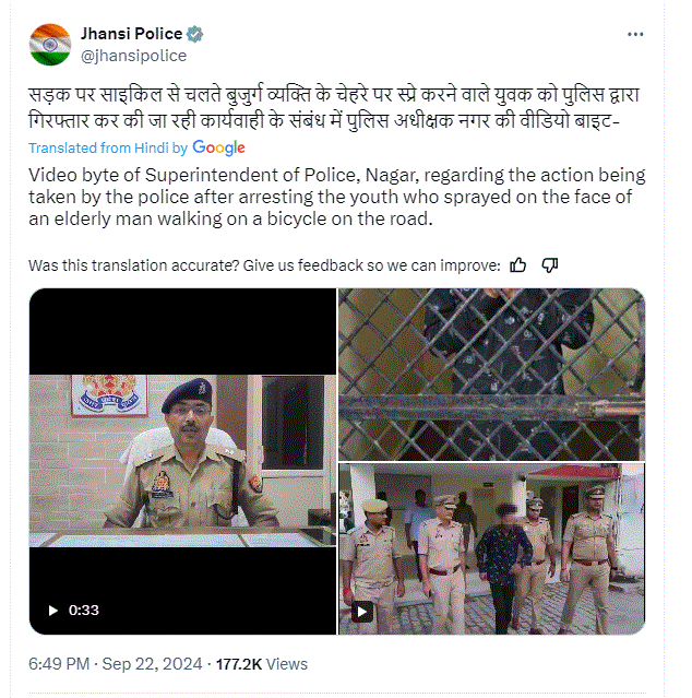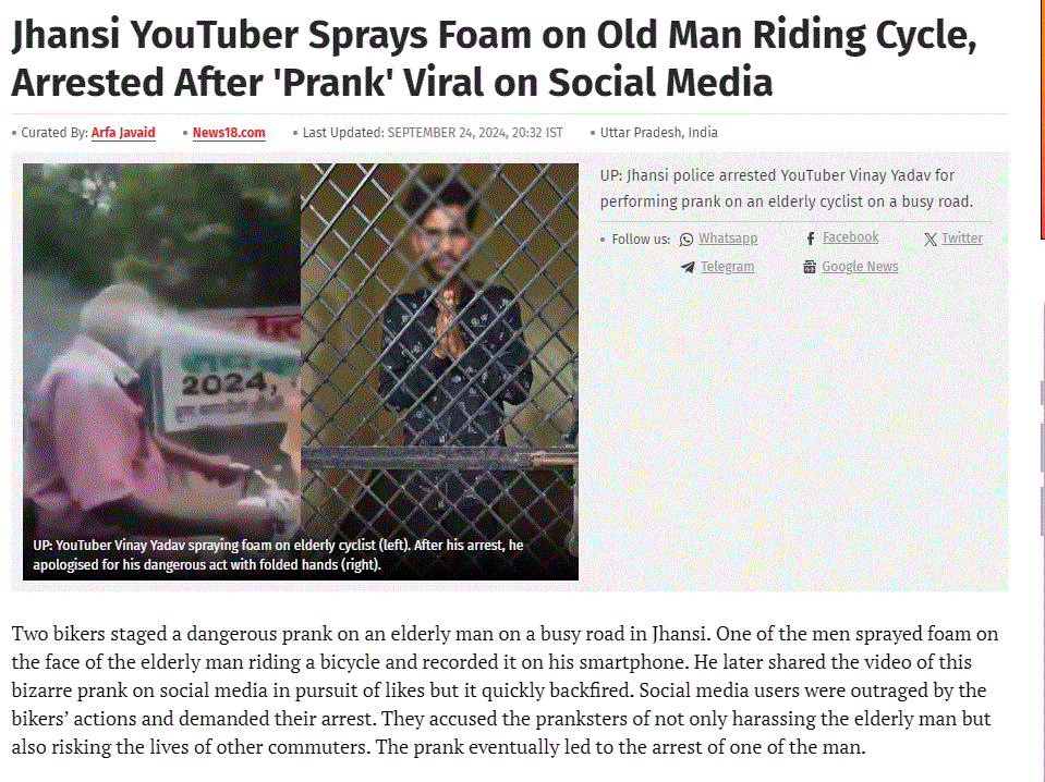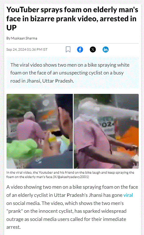 ಸೆಪ್ಟೆಂಬರ್ 24,2024ರಂದು ನ್ಯೂಸ್‌ 18 ಈ ಕುರಿತು ವರದಿ ಪ್ರಕಟಿಸಿತ್ತು. ವರದಿಯಲ್ಲಿ “ಝಾನ್ಸಿಯ ನವಾಬಾದ್ ಪ್ರದೇಶದ ಎಲೈಟ್ -ಚಿತ್ರಾ ರಸ್ತೆಯ ಮೇಲ್ಸೇತುವೆ ಬಳಿ ಇಬ್ಬರು ಬೈಕ್ ಸವಾರರು ವೃದ್ದರೊಬ್ಬರ ಮುಖಕ್ಕೆ ನೊರೆ ಎರಚಿ ತಮ್ಮ ಮೊಬೈಲ್‌ನಲ್ಲಿ ವಿಡಿಯೋ ರೆಕಾರ್ಡ್ ಮಾಡಿಕೊಂಡಿದ್ದಾರೆ. ಅದನ್ನು ಲೈಕ್ಸ್‌ಗೋಸ್ಕರ ಸಾಮಾಜಿಕ ಮಾಧ್ಯಮದಲ್ಲಿ ಹಂಚಿಕೊಂಡಿದ್ದಾರೆ. ವಿಡಿಯೋ ವೈರಲ್ ಆಗಿ ಸಾರ್ವಜನಿಕರಿಂದ ಆಕ್ರೋಶ ವ್ಯಕ್ತವಾದ ಬಳಿಕ ಪೊಲೀಸರು ವಿನಯ್ ಯಾದವ್ ಎಂಬ ಆರೋಪಿಯನ್ನು ಬಂಧಿಸಿದ್ದಾರೆ. ಆತ ಯೂಟ್ಯೂಬರ್” ಎಂದು ಪೊಲೀಸರು ತಿಳಿಸಿರುವುದಾಗಿ ಹೇಳಲಾಗಿತ್ತು.