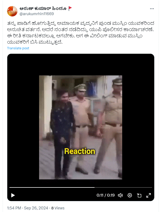 ಅರುಣ್ ಕುಮಾರ್ ಹಿಂದೂ ಎಂಬ ಎಕ್ಸ್‌ ಖಾತೆಯಲ್ಲೂ ಸೆಪ್ಟೆಂಬರ್ 26ರಂದು ವಿಡಿಯೋ ಹಂಚಿಕೊಂಡು ” ತನ್ನ ಪಾಡಿಗೆ ಹೋಗುತ್ತಿದ್ದ ಅಮಾಯಕ ವೃದ್ಧನಿಗೆ ಪುಂಡ ಮುಸ್ಲಿಂ ಯುವಕರಿಂದ ಅನುಚಿತ ವರ್ತನೆ. ಆದರೆ ನಂತರ ನಡೆದಿದ್ದು ಯುಪಿ ಪೊಲೀಸರ ಕಾರ್ಯಾಚರಣೆ. ಈ ರೀತಿ ಕರ್ನಾಟಕದಲ್ಲೂ ಆಗಬೇಕು. ಆಗ ಈ ವೀಲಿಂಗ್ ಮಾಡುವ ಮುಸ್ಲಿಂ ಯುವಕರಿಗೆ ಬಿಸಿ ಮುಟ್ಟುತ್ತದೆ” ಎಂದು ಬರೆದುಕೊಂಡಿದ್ದರು.