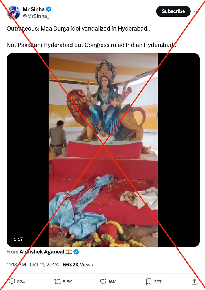 ಸುಳ್ಳು, ಕೋಮು ದ್ವೇಷದ ಸುದ್ದಿಗಳನ್ನು ಹಬ್ಬಿಸುವುದರಲ್ಲಿ ಕುಖ್ಯಾತಿ ಪಡೆದಿರುವ ಬಲಪಂಥೀಯ ಎಕ್ಸ್ ಬಳಕೆದಾರ ರೌಶನ್ ಸಿನ್ಹಾ ಅಥವಾ ಮಿ.ಸಿನ್ಹಾ (@MrSinha_) ಅಕ್ಟೋಬರ್ 11ರಂದು ವಿಡಿಯೋ ಹಂಚಿಕೊಂಡು “ಅತಿರೇಕ: ಹೈದರಾಬಾದ್‌ನಲ್ಲಿ ಮಾತೆ ದುರ್ಗೆಯ ಮೂರ್ತಿ ಧ್ವಂಸಗೊಳಿಸಲಾಗಿದೆ. ಇದು ಪಾಕಿಸ್ತಾನದ ಹೈದರಾಬಾದ್ ಅಲ್ಲ, ಕಾಂಗ್ರೆಸ್ ಆಡಳಿತ ಭಾರತದ ಹೈದರಾಬಾದ್” ಎಂದು ಬರೆದುಕೊಂಡಿದ್ದರು.