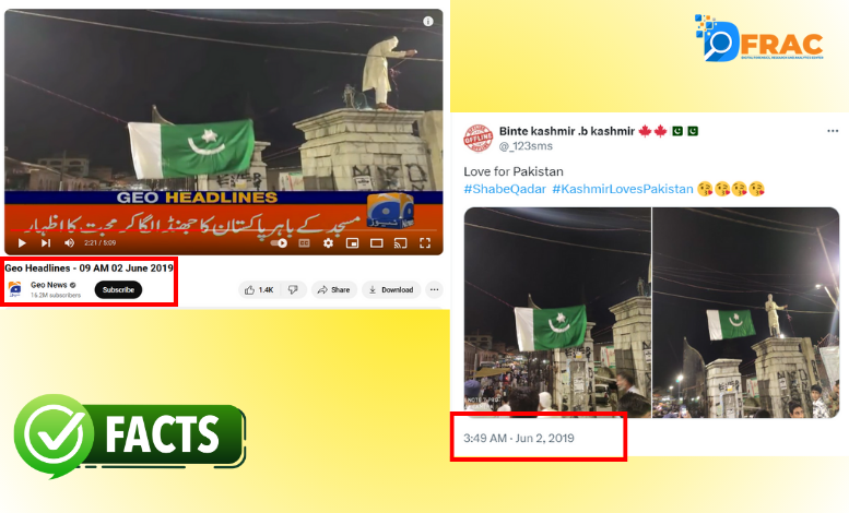 ಸೋಶಿಯಲ್ ಮೀಡಿಯಾದಲ್ಲಿ ಹಂಚಿಕೊಳ್ಳಲಾದ ಫೋಟೋವನ್ನು ಗೂಗಲ್ ರಿವರ್ಸ್ ಇಮೇಜ್ನಲ್ಲಿ ಸರ್ಚ್ ಮಾಡಿದಾಗ, ಅದು 2019ರ ಹಳೆಯ ಫೋಟೋ ಎಂದು ತಿಳಿದು ಬಂದಿದೆ. ಇದೇ ಚಿತ್ರವನ್ನು ಈ ಹಿಂದೆ ಪಾಕಿಸ್ತಾನಿ ಮಾಧ್ಯಮಗಳು ಮತ್ತು ಟ್ವಿಟರ್ ಬಳಕೆದಾರರು 2019ರಲ್ಲಿ ಹಂಚಿಕೊಂಡ ಮಾಹಿತಿ ಲಭ್ಯವಾಗಿದೆ. ಈಗ ಮತ್ತೆ ಅದೇ ಫೋಟೋವನ್ನು 78ನೇ ಸ್ವಾತಂತ್ರ್ಯ ದಿನದಂದು ಶ್ರೀನಗರದಲ್ಲಿ ಪಾಕಿಸ್ತಾನದ ಧ್ವಜವನ್ನು ಹಾರಿಸಲಾಗಿದೆ ಎಂಬ ಸುಳ್ಳು ನಿರೂಪಣೆಯೊಂದಿಗೆ ಹಂಚಿಕೊಂಡಿರುವುದು ಸ್ಪಷ್ಟವಾಗುತ್ತದೆ ಎಂದು DFRAC ಪತ್ತೆ ಮಾಡಿದೆ.