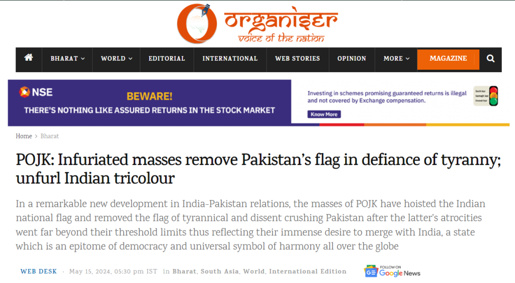 ಕೆಲವು ಪಾಕಿಸ್ತಾನಿ ಖಾತೆಗಳು ಮಾಡಿದ ಪ್ರತಿಪಾದನೆಗೆ ವ್ಯತಿರಿಕ್ತವಾಗಿ, ಪಾಕಿಸ್ತಾನ ಆಕ್ರಮಿತ ಜಮ್ಮು ಮತ್ತು ಕಾಶ್ಮೀರದ (POJK)ರಾವಲಕೋಟ್ನಲ್ಲಿ ಪ್ರತಿಭಟನಾಕಾರರು ಪಾಕಿಸ್ತಾನದ ಧ್ವಜವನ್ನು ತೆಗೆದು ಭಾರತೀಯ ತ್ರಿವರ್ಣ ಧ್ವಜವನ್ನು ಹಾರಿಸಿದ ಇತ್ತೀಚಿನ ವರದಿಗಳಿವೆ. ಹಾಗಾಗಿ ಈ ಘಟನೆ ಸಾಮಾಜಿಕ ಮಾಧ್ಯಮಗಳಲ್ಲಿ ನಿರೂಪಣೆಗೊಂಡ ಪೋಸ್ಟ್ಗಳಿಗಿಂತ ಭಿನ್ನವಾಗಿದೆ.