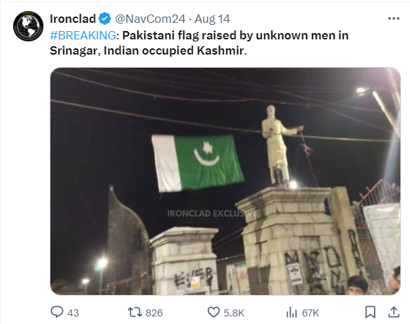 ಭಾರತದ ಸ್ವಾತಂತ್ರ್ಯ ದಿನಾಚರಣೆಯ ಸಂದರ್ಭ ಕಾಶ್ಮೀರದ ಶ್ರೀನಗರದಲ್ಲಿ ಅಪರಿಚಿತ ವ್ಯಕ್ತಿಗಳು ಪಾಕಿಸ್ತಾನದ ಧ್ವಜ ಹಾರಿಸಿದ್ದಾರೆ ಎಂದು ಪ್ರತಿಪಾದಿಸಿ ಸಾಮಾಜಿಕ ಮಾಧ್ಯಮಗಳಲ್ಲಿ ಕೆಲವು ಮುಸ್ಲಿಂ ಹೆಸರುಗಳನ್ನೊಳಗೊಂಡ ಖಾತೆಗಳಿಂದ ಪೋಸ್ಟ್ಗಳನ್ನು ಹಂಚಿಕೊಳ್ಳಲಾಗಿದೆ.