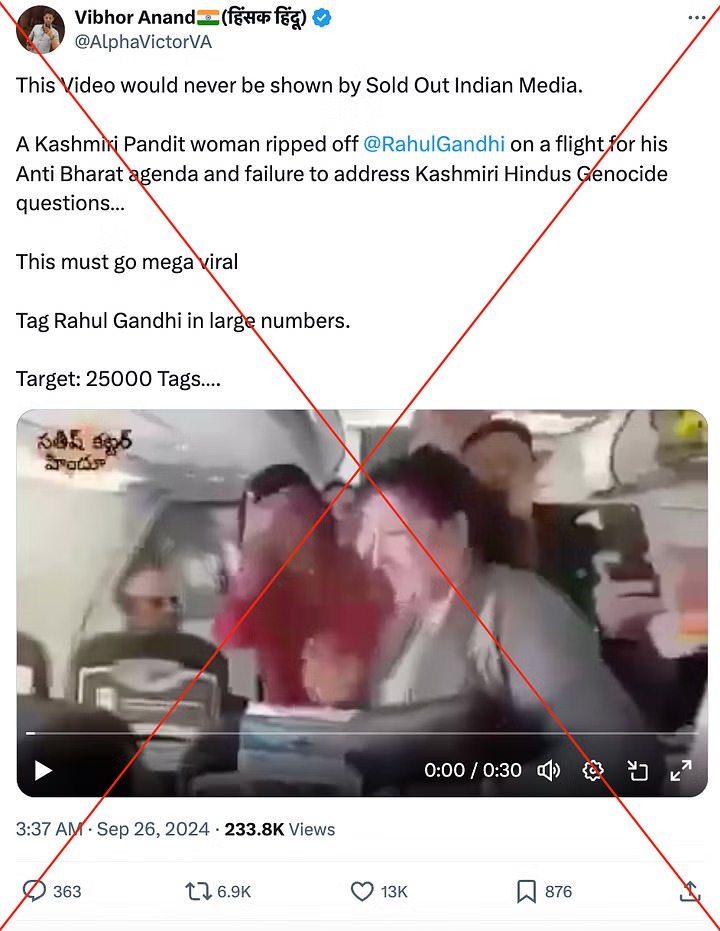 ಸೆಪ್ಟೆಂಬರ್ 26ರಂದು ಎಕ್ಸ್ನಲ್ಲಿ ಈ ವಿಡಿಯೋ ಹಂಚಿಕೊಂಡಿರುವ ‘ವಿಭೋರ್ ಆನಂದ್’ ಎಂಬ ಎಕ್ಸ್ ಬಳಕೆದಾರ “ಮಾರಾಟಗೊಂಡ ಭಾರತದ ಮಾಧ್ಯಮಗಳು ಈ ವಿಡಿಯೋ ತೋರಿಸುವುದಿಲ್ಲ. ಭಾರತ ವಿರೋಧಿ ನಿಲುವು ಮತ್ತು ಕಾಶ್ಮೀರಿ ಹಿಂದೂಗಳ ಸಮಸ್ಯೆಗಳ ಬಗ್ಗೆ ಗಮನ ಹರಿಸದ ರಾಹುಲ್ ಗಾಂಧಿಯನ್ನು ಕಾಶ್ಮೀರಿ ಪಂಡಿತ ಮಹಿಳೆಯೊಬ್ಬರು ವಿಮಾನದಲ್ಲಿ ತರಾಟೆಗೆ ತೆಗೆದುಕೊಂಡಿದ್ದಾರೆ. ಇದು ದೊಡ್ಡ ಮಟ್ಟದಲ್ಲಿ ವೈರಲ್ ಆಗಬೇಕು. ಹೆಚ್ಚಿನ ಸಂಖ್ಯೆಯಲ್ಲಿ ರಾಹುಲ್ ಗಾಂಧಿಗೆ ಟ್ಯಾಗ್ ಮಾಡಿ. 25 ಸಾವಿರದ ಗುರಿ” ಎಂದು ಬರೆದುಕೊಂಡಿದ್ದರು.