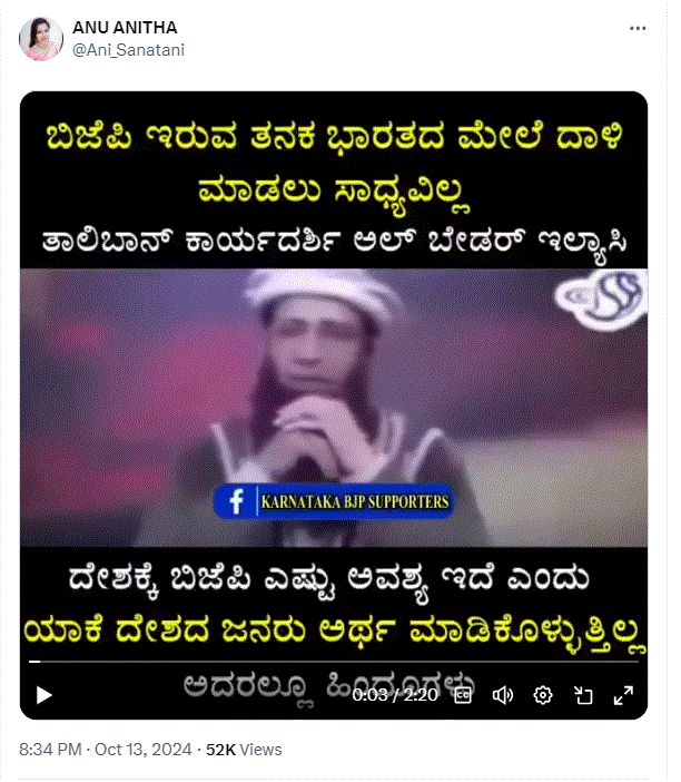 “ಭಾರತದಲ್ಲಿ ಬಿಜೆಪಿ ಇರುವವರೆಗೂ ಯಾವುದೇ ದೇಶ ಭಾರತದ ಮೇಲೆ ದಾಳಿ ಮಾಡಲು ಸಾಧ್ಯವಿಲ್ಲ. ಆರೆಸ್ಸೆಸ್ ಮತ್ತು ಬಿಜೆಪಿ ಅತ್ಯಂತ ಶಕ್ತಿಶಾಲಿ. ಮೊದಲು ಬಿಜೆಪಿಯನ್ನು ತೊಡೆದುಹಾಕಿ ನಂತರ ಮಾತ್ರ ಭಾರತದ ಮೇಲೆ ಜಯ ಸಿಗುತ್ತದೆ…ಭಯೋತ್ಪಾದಕ ಸಂಘಟನೆ ತಾಲಿಬಾನ್ನ ಮುಖ್ಯ ಕಾರ್ಯದರ್ಶಿ ಅಲ್ ಬೇಡರ್ ಇಲ್ಯಾಸಿ ಹೇಳಿಕೆ” ಎಂಬ ಪ್ರತಿಪಾದನೆಯೊಂದಿಗೆ ಅಕ್ಟೋಬರ್ 9, 2023ರಂದು Karnataka BJP Supporters ಫೇಸ್ಬುಕ್ ಪೇಜ್ನಲ್ಲಿ ವಿಡಿಯೋ ಪೋಸ್ಟ್ ಮಾಡಲಾಗಿತ್ತು.