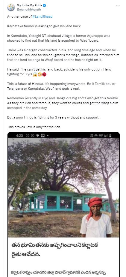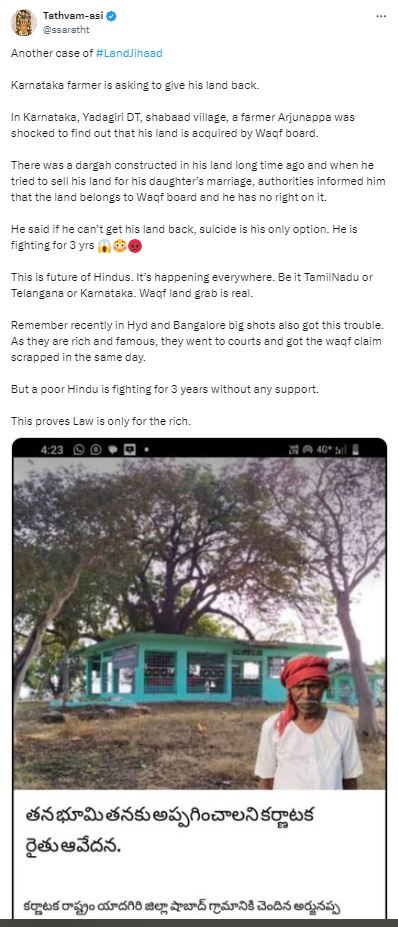 Tathvam-asi(@ssaratht) ಎಂಬ ಎಕ್ಸ್ ಬಳಕೆದಾರೊಬ್ಬರು ಸುದ್ದಿಯ ಸ್ಕ್ರೀನ್ ಶಾಟ್ ಹಂಚಿಕೊಂಡು ” ಮತ್ತೊಂದು ಲ್ಯಾಂಡ್ ಜಿಹಾದ್. ಕರ್ನಾಟಕದ ಯಾದಗಿರಿ ಜಿಲ್ಲೆಯ ಶಾಬಾದ್ ಗ್ರಾಮದಲ್ಲಿ ರೈತ ಅರ್ಜುನಪ್ಪ ತಮ್ಮ ಜಮೀನು ವಕ್ಫ್ ಮಂಡಳಿ ಸ್ವಾಧೀನಪಡಿಸಿಕೊಂಡಿರುವುದನ್ನು ಕಂಡು ಬೆಚ್ಚಿಬಿದ್ದಿದ್ದಾರೆ”