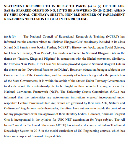 ಡಿಸೆಂಬರ್ 2021 ರಲ್ಲಿ, ಲೋಕಸಭೆಯಲ್ಲಿ ಪ್ರಶ್ನೆಯೊಂದಕ್ಕೆ ಪ್ರತಿಕ್ರಿಯಿಸಿದ ಕೇಂದ್ರ ಶಿಕ್ಷಣ ಸಚಿವರು ಭಗವದ್ಗೀತೆಗೆ ಸಂಬಂಧಿಸಿದ ವಿಷಯವು ಈಗಾಗಲೇ ಸೆಂಟ್ರಲ್ ಬೋರ್ಡ್ ಆಫ್ ಸೆಕೆಂಡರಿ ಎಜುಕೇಶನ್ (CBSE)ನಲ್ಲಿ ವಿವಿಧ ತರಗತಿಗಳ ಭಾಗವಾಗಿದೆ ಎಂದು ತಿಳಿಸಿದ್ದರು.