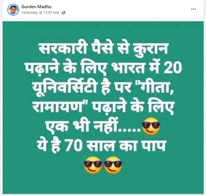 “ಭಾರತದಲ್ಲಿ 20 ಸರ್ಕಾರಿ ಅನುದಾನಿತ ವಿಶ್ವ ವಿದ್ಯಾನಿಲಯಗಳು ಕುರಾನ್ ಅಧ್ಯಯನ ಮಾಡಲು ಕೋರ್ಸ್ಗಳನ್ನು ನೀಡುತ್ತಿವೆ. ಆದರೆ, ಭಗವದ್ಗೀತೆ ಅಥವಾ ರಾಮಾಯಣವನ್ನು ಅಧ್ಯಯನ ಮಾಡಲು ಯಾವುದೇ ಕೋರ್ಸ್ಗಳಿಲ್ಲ” ಎಂಬ ಪೋಸ್ಟ್ ಸಾಮಾಜಿಕ ಮಾಧ್ಯಮದಲ್ಲಿ ಹಂಚಿಕೊಳ್ಳಲಾಗಿದೆ.